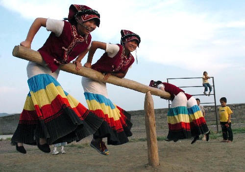 磨磨秋千是深受贵州彝族群众喜爱的一种传统娱乐体育项目,它是将一根有凹槽的横木放在另一根固定在地上的尖木上,人在横木两端像推磨一样地上下快速旋转、飞荡,有人称之为“彝族过山车”。