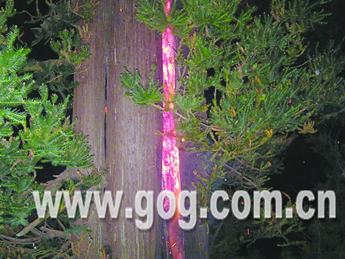然而,更让人吃惊的是,8月20日深夜11时,右边的这棵千年古杉突然自燃起火。当地村民发现后,立即拨打119,随后,毕节市消防官兵迅速赶到将大火扑灭。然而,让人没想到的是,在没有打雷等任何异常天气的第二天上午10时和下午4时,千年古杉又先后两次发生自燃。据当地村民介绍:火源都是从树干上部的中间冒出(如图),古杉自燃后火势非常大,火焰迅速蹿到树顶,并很快将整棵树包围。