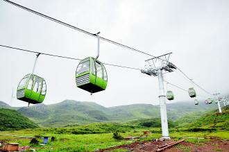 近日,大韭菜坪景区开始试运营。大韭菜坪是万亩连片野韭菜花保护地,拥有野生韭菜花面积达30多万亩,已成功申报“中国野生韭菜——多星韭之乡”,赫章县今年通过招商投入2.5亿元对景区进行打造。图为该景区即将投入使用的我省最高索道缆车。