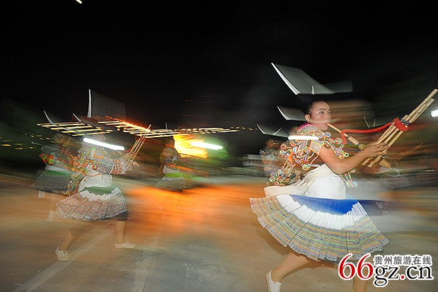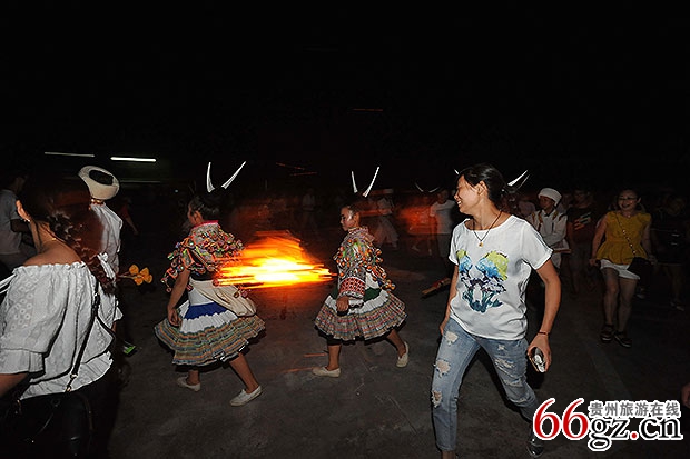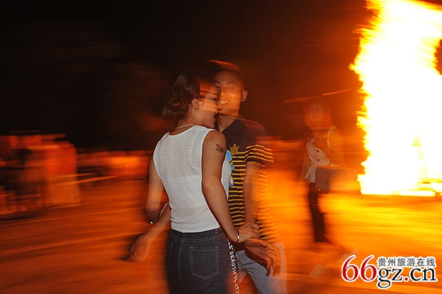 一曲苗族芦笙歌舞《迎亲》拉开了篝火晚会的序幕。晚会以跳舞、玩游戏为主要内容。晚会上,情侣们参加“爱的抱抱”趣味游戏,共同收获欢乐和礼物。伴随着苗族欢快的芦笙歌舞,在苗族姑娘小伙的带领下,大家围着火堆欢快地跳起了舞蹈。