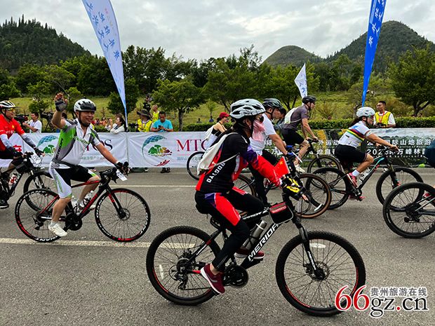 9月20日,黔西南自治州兴义市万峰林景区阳光明媚、秋风习习、彩旗招展、热闹异常,2023国际山地旅游暨户外运动大会的重要主体活动之一、2023环万峰林国际山地自行车赛(简称自行车赛)在这里鸣枪举行。 来自国内外的1000余名选手齐聚万峰林,激情飞扬活力四射,展开一场力量与速度的竞赛追逐,飞驰的健美人和自行车,与喀斯特风光组成一条魅力无限的风景线。