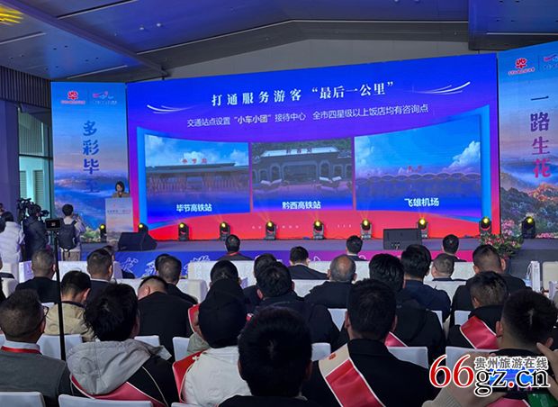 刘元刚在致辞说,今天的百里杜鹃旅游品牌深入人心、旅游产品丰富多元、旅游配套设施完善。当前,正聚焦省委主要领导“建设世界级旅游目的地”的指示要求,感恩奋进、感恩思进,围绕客源“引”、紧扣服务“提”,充分发挥生态优势,大力发展旅游经济,坚决确保杜鹃花季以崭新面貌迎接游客,乘势而上推动旅游业高质量发展;饶萍作推介时指出,毕节市围绕“开发新场景、打造新产品、满足新需求”目标,以杜鹃花季品牌为引领,对春季旅游产品持续提质升级,推进毕节“春赏花”旅游业态与秀水、峡谷、美食、文化、乡村、露营、温泉等旅游资源融合发展,休闲度假、集散服务、风情小镇、美丽乡村、精品酒店等旅游业态更成熟。同时发布了百里杜鹃非遗集市、“小车小团”交旅融合产品、“毕节有礼”文创等新产品及毕节市即将推出的鼓励旅行社“引客入毕”奖励大礼包,并将百里杜鹃花季纳入奖励时段;彭婷重点推荐百里杜鹃5个主题精品旅游线路及今年的花都城区夜游、普底景区航天航空体验研学馆两个新场景等“三新体验”和有关新产品、新玩法,发布了“一多”“四免”优惠政策:“一多”即百里杜鹃景区门票“一票五日游”,观光车票“一票三日乘”。“四免”即花季期间,凭百里杜鹃景区入园有效凭证,可免费乘坐百里杜鹃花都城区至普底、金坡景区的景城互通公交车;凭百里杜鹃景区门票,可免票进入方家坪景区;凭百里杜鹃景区门票,可免票进入彝山花谷景区;凭入住百里杜鹃酒店凭证,可免票进入方家坪景区。