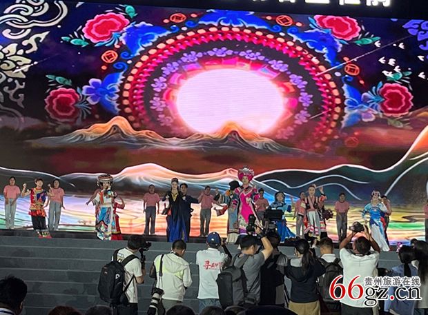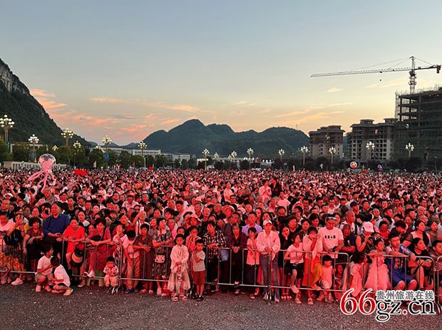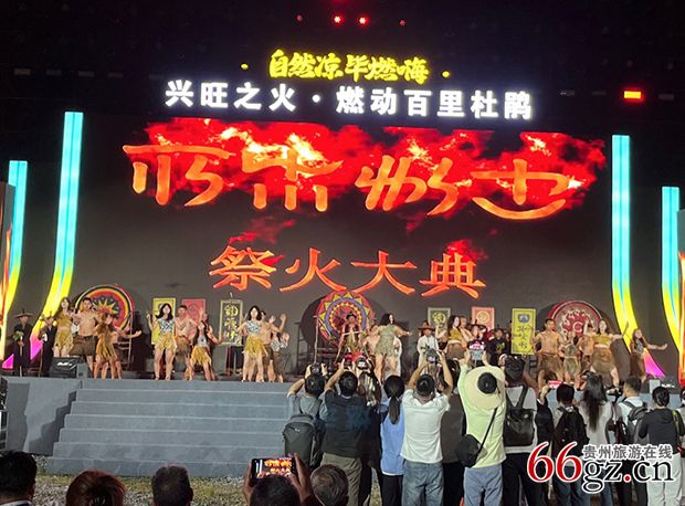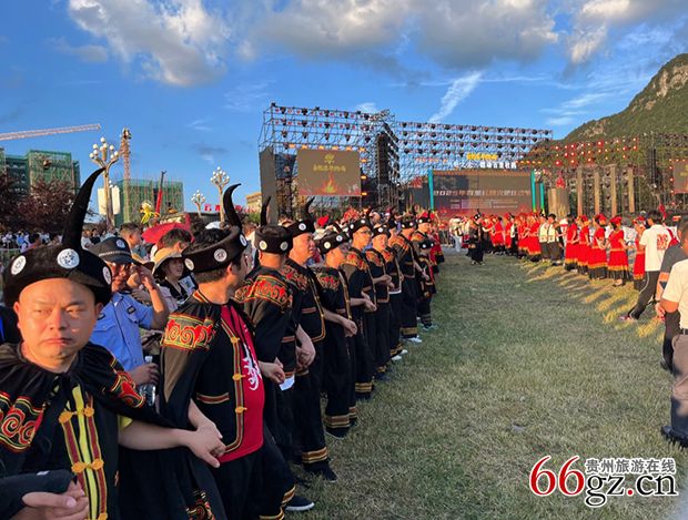 8月13日晚7时,贵州百里杜鹃风景区花瓣桥主会场外已经挤满观众,在民警和保安人员维持下,身着传统服装的彝族同胞列队组成人墙辟出通道,迎接嘉宾及内场人员进入,举目四望,人山人海。