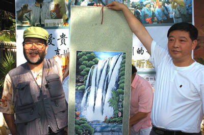 日本友人吉川团十郎在接受贵阳市旅游局赠送的黄果树大瀑布的山水画
