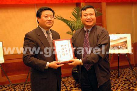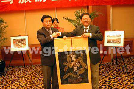[省旅游局傅迎春副局长与考察团互赠纪念品]