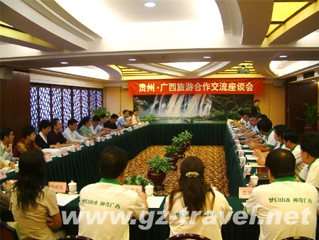 早9点,合作交流座谈会在贵州饭店召开,贵州省旅游局杨胜明局长对贵州省旅游的总体情况做了简单的介绍并对广西自治区旅游局的来访表示真诚的感谢,广西自治区旅游局黄桂辛局长对广西旅游的总体情况做了简单介绍并对贵州省旅游局的热情接待表示感谢,会议中双方就合作的各项议程进行了深入的交流.