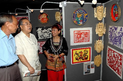 5月2日,11岁的贵州小画家廖兴鸿(前右一)将自己的作品赠送给年逾九旬的香港普宁同乡联谊会创会会长庄世平(左二)。5月2日,香港市民在参观贵州小画家创作的艺术作品。