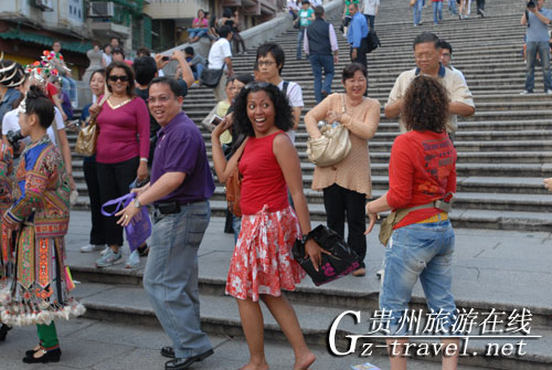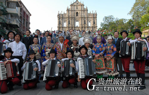 来自贵州的少数民族在澳门标志建筑大三巴前跳起了舞