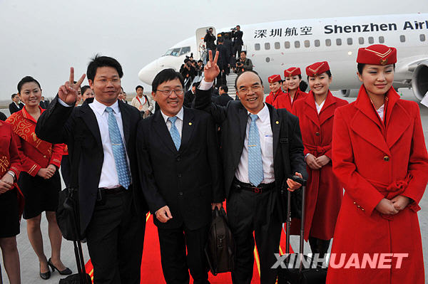 12月15日,三位台胞在深圳机场登机时挥手致意。当日早上7时20分,作为两岸直接“三通”首个飞往台湾的大陆航班,深圳航空zh9095航班正式从深圳机场起飞。