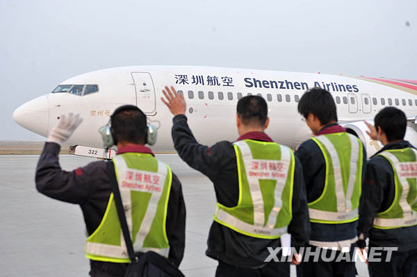 12月15日,工作人员在深圳机场向即将起飞的飞机挥手致意。