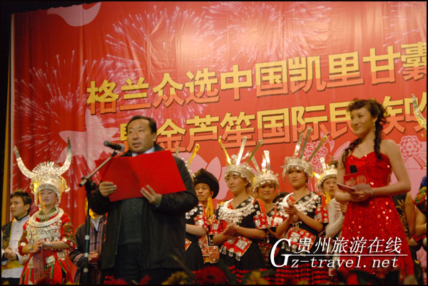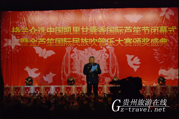 本站讯 今天,2010中国凯里甘囊香国际芦笙节闭幕式暨首届凯里国际民族吹管乐大赛颁奖晚会在凯里市行政中心礼堂隆重举行。晚会首先由黔东南州政协主席、凯里市委书记杨正明致词,中国音乐家协会副主席著名剧作家、词作家阎肃也亲临现场致辞,相关领导和本次大赛的评委为首届国际民族吹管乐大赛获奖选手、创意市集·就是甘囊香创意设计大赛获奖选手及对这次活动做出突出贡献的单位颁奖。晚会上,获奖得本届大赛的一等奖选手及凯棠大歌表演队等表演了精彩的文艺节目。最后中共凯里市委副书记、市人民政府市长洪金洲宣布2010中国凯里甘囊香国际芦笙节圆满闭幕。