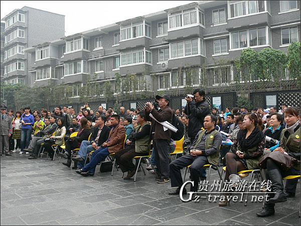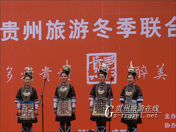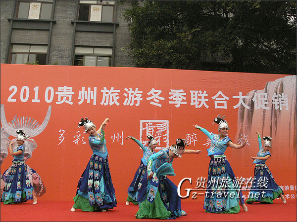 11月10日下午一点,2010贵州旅游冬季联合大促销暨旅游推荐会公众推荐会,在成都宽窄巷子广场举行,在贵州姑娘婀娜多姿的的苗族舞蹈当中准时开始,推荐会一开始 ,就受到成都朋友们的热烈欢迎,纷纷到台前领取贵州景点介绍的资料,想要进一步认识贵州。