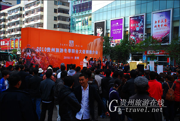 本网讯 11月24日,“2010贵州旅游冬季联合大促销推介会”第三站昆明,公众推介会在昆明市南屏街广场隆重举行,美丽动听的侗族大歌及多姿多彩的苗族舞蹈吸引了广大市民前来观看,此次公众推介会向昆明市民赠送总价值15万元的贵州知名景区门票1000张以及各种书籍海报,并开展抽奖活动及答题获取门票活动,诚邀云南“邻居”走进多彩贵州、感受多彩贵州。