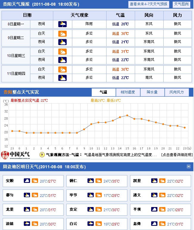 从预报来看,贵阳今天白天阴天到多云,夜间多云,气温27-19℃,偏东风1-2级,相对湿度50-85%。很明显,天气将比昨天要热,表现为早晚凉爽、舒适,午后偏热,建议广大市民穿短裙、短裤、短套装、t恤等夏季服装。年老体弱者宜着长袖衬衫和单裤。紫外线强度比较弱,建议出门前涂擦防晒护肤品。