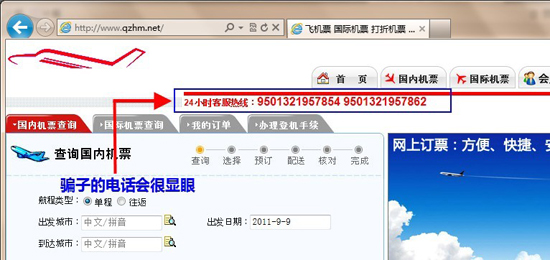 骗子的网站往往会留一个特别显眼的电话,多是400开头或95013开头。而正规的航空公司电话往往是955开头的5-6位数,电话号码不会很长,以方便记忆。只有机票代理点才会使用普通电话,其他特征继续往下看。