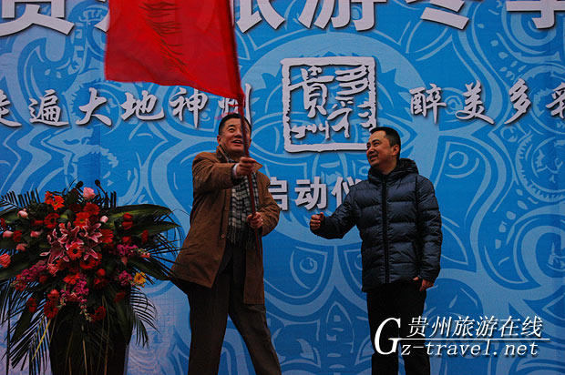贵州省旅游局副局长杨俊(左)、贵阳市旅游行业协会副会长、旅行社分会会长吴比(右)接过启动旗帜