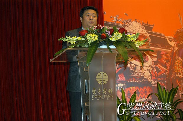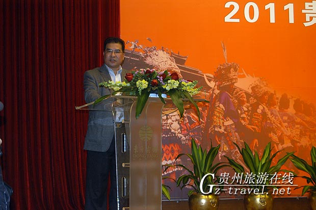 贵州省旅游局局长傅迎春在广州促销推荐会现场发表讲话