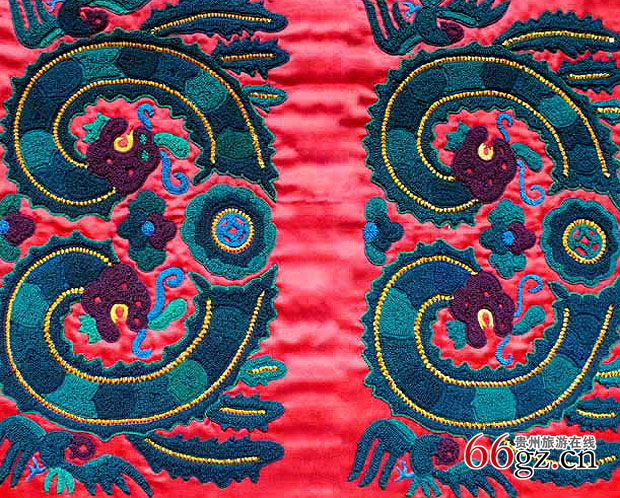 贵州的苗族刺绣,有的不用起草,信手绣出;有的在布面上画好图案再绣;有的用剪纸样子粘贴后进行刺绣。苗绣的纹样造型多为夸张得体、风格独特的飞禽走兽、花鸟鱼虫,如麒麟、龙、凤和常见的虫、鱼、花卉、桃子、石榴等,其中以龙、鱼、蝴蝶、蜈蚣、蝙蝠等图案最为常见。尽管苗绣的内容十分广泛,但其纹样形式是统一的,一般都采用水云纹,很多形成s状。这些图案还有明显的阴阳结合、创造生命的寓意。表达了苗族祖先对自然、宇宙、对生命起源的理解和认识。
