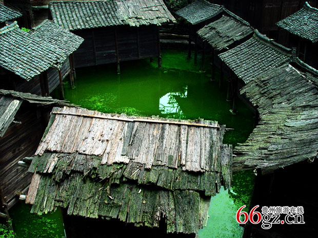 在贵州省黔东南州雷山县大塘乡新桥寨,至今仍保留着大量奇特又实用的“水上粮仓”。这些粮仓建在村寨的水塘中,为全木结构,底部立在露出水面的石墩上,把木质粮食仓库科学地修建在池塘之中,别具一格,既防火,又防鼠,同时,池塘中还可以养鱼、养鹅、养鸭,一举多得。