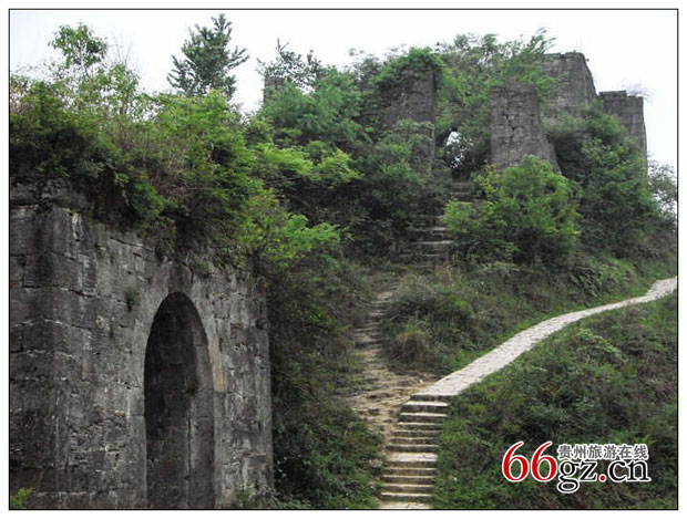 “登囤古道”全长474米,沿山而上,下临沟谷,倚崖凿壁而成。侧有护墙,是连接“飞虎”、“飞龙”二关的重要军事通道。海龙囤不仅只有囤前遗址,还有囤顶朝天关、飞凤关、宋代老王宫、明代新王宫、采石场、绣花楼等遗址。而在囤后,还有土城、月城环山而立,万安关、西关、后关三座城门从高到低构成三道关口。在海龙囤周围,还有“养马场”、“校场坝”等遗址。