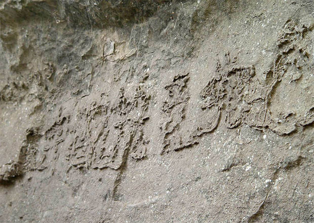 “藏字石”位于贵州省平塘县西北角的桃坡村掌布乡,说起“藏字石”的发现,还是2002年春,当地举办摄影活动,桃坡村支部书记王国富在清扫此地时无意中发现一巨石。巨石是从石壁上坠落而下后分为两半,相距可容两人,两石各长七米多,高度近三米,重一百余吨。由于两石间长期堆放秸秆树枝,石旁又有两株大树遮掩,从未引起人们的注意。裂面上清晰可见五个横排的大字“中国共产党”,字体匀称方整,每字近一尺见方,笔划直挺,突起于石面,这消息立即一传十、十传百,甚至越传越玄。前来探奇的游客先后给它取了“天书”、“藏字石”、“太阳石”、“神石”等名称。