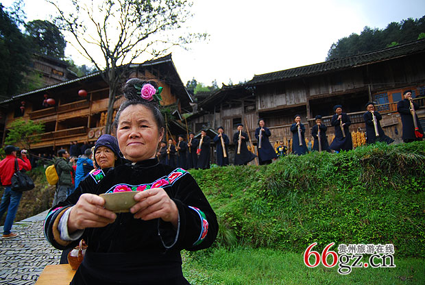 拦门酒是贵州黔东南苗族村寨的一种古老的习俗,是苗寨最为盛行和最有特色的一种迎宾习俗。苗家娶亲嫁女,亲戚朋友都要上门送礼贺喜。好客的主人和贤惠大方的亲朋戚友,总是要把这门喜事办得体面热闹,同时也总是要借个良好的机会展示自己的富有,广交朋友。主人把事先早已准备好的迎宾酒,请来寨子里德高望重的族老和歌师,在自家的大门口摆下大方桌,桌子上摆满了一碗碗喷着清香的美酒。客人来时,由主管把门的族老首先唱讲贺词,然后,客人中最年长且声望高的长者唱答谢词。