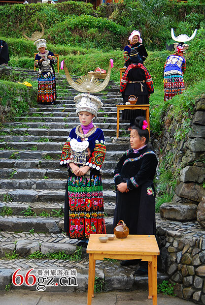 其中为最出名的要数朗德上寨的十二道拦门酒,从寨脚公路开始,到寨头的进寨门楼,设迎客拦门酒卡,多达12道。每道酒卡,在路中间放一张方桌,两边站着几个身着盛装的苗族男女青年,提壶端杯,向客人敬酒,每道两土碗,在这里可解释为:一道恭喜碟母窝;二道昌盛十二宝;三道勤劳扁瑟缟;四道善良五好汉,五道宽宏水滔天;六道富裕运金银,七道明亮铸日月;八道美丽仰阿瑟,九道长寿榜香尤、十道英雄杨大六;十一道智慧嘎尼拉;十二道华贵香骑马。