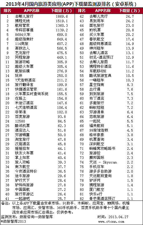 据最新发布的《2013年4月国内旅游类应用(app)市场监测报告》显示,国内安卓系统旅游类应用产品下载量排名前十位的依次是:去哪儿旅行、携程无线、航班管家、号码百事通、8684火车、超级指南针、114商旅、高铁达人、艺龙旅行以及同程旅游。