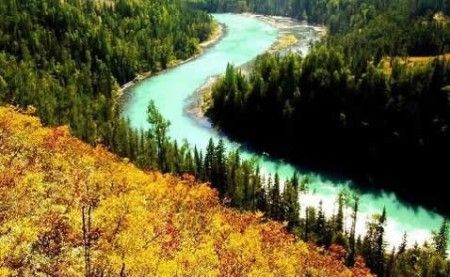 这里有成片的桦树林覆盖在山的南麓。喀纳斯河与禾木河的河水都来自额尔齐斯河,喀纳斯河与禾木河形成一个半圆,分别绕着阿勒泰山流向俄罗斯与蒙古。这儿山青水秀,皑皑的白雪在阿勒泰山顶静静地覆盖着。由于人烟稀少,这儿的植被保存得十分完好。眼下正值秋季,也是这里一年一度的“色彩大展演”的时分,满山的桦树叶黄了,枫树叶红了,秋风中,整座山都在抖动,一片金黄。走进这童话般的世界中,走路都会十分小心,生怕踩折了嫩枝,踏伤了小草,破坏了大自然的宁静与无暇。