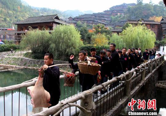 结束“偷亲”后,大概早上8点,女方会在当地苗族妇女的帮助下穿上苗族盛装在阁楼等候男方的到来。同时,男方带着准备好的大公鸭、糯米饭、白酒、猪腿、鲤鱼、红蛋、鞭炮、糖果等到女方家接亲,见到女方之前必须通过女方家至少3道的拦门酒。