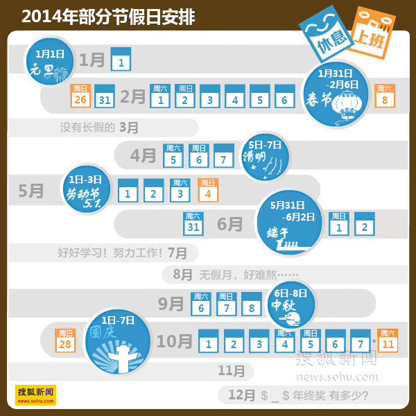 2014年节假日放假安排已公布,法定节假日总量仍为11天,有网民吐槽称“跟国外比中国的假期太少”,记者搜集到的资料显示,实际上,全球62个国家和地区法定节假日平均为11.7天,而我国以11天排在并列33位,属中等水平,与法国、意大利等国家持平,超过了澳大利亚、美国、德国、加拿大、英国等发达国家。