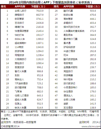 据最新发布的《2014年2月国内旅游类应用(APP)市场监测报告》显示,国内安卓系统旅游类应用产品下载量排名前十位的依次是:去哪儿旅行、携程旅行、航班管家、艺龙旅行、嘀嘀打车、快捷酒店管家、快的打车、8684火车、超级指南针以及114商旅。