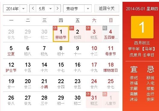 日前,2014年五一劳动节放假安排出炉,根据规定,4月29日至5月1日放假调休3天,其中4月27日(星期六)、4月28日(星期日)公休调至4月29日(星期一)、4月30日(星期二),5月1日为法定节假日。4月27日(星期六)、4月28日(星期日)正常上班。