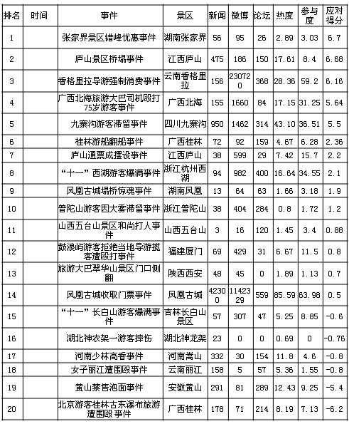 针对此现象,人民网舆情监测室联合红网舆情中心撰写并发通过搜集整理2013年国内旅游景区重大舆情事件,运用舆情监测系统进行热度统计,通过定量与定性分析相结合的方法得出舆情应对分数,最后得出《2013年国内旅游景区热点舆情事件应对排行榜》。其中,“张家界景区错峰优惠”舆情应对得分居首,“北京游客桂林古东瀑布旅游遭围殴事件”垫底。