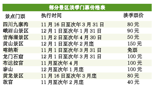 记者了解到,游客十分关心的景区门票,也随着11月份的到来进入“淡季”,纷纷相应调整门票价格,部分景区门票价格低于五折。