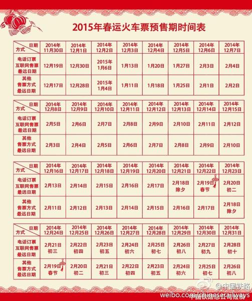 昨日,记者从贵阳火车站了解到,为了方便旅客购票,铁路互联网售票、电话订票分三个时段分别延长了预售期,具体步骤为:12月1日,预售期由原来20天延长至30天,即12月1日可购买12月30日之前的车票;12月2日至12月6日,预售期每天再比上一日延长6天;12月7日开始,即可购买2015年春运第一天(2015年2月4日)的车票,预售期为60天。