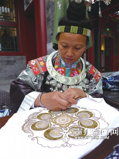苗族手艺人在展览上画蜡染。(图片由展览方提供)