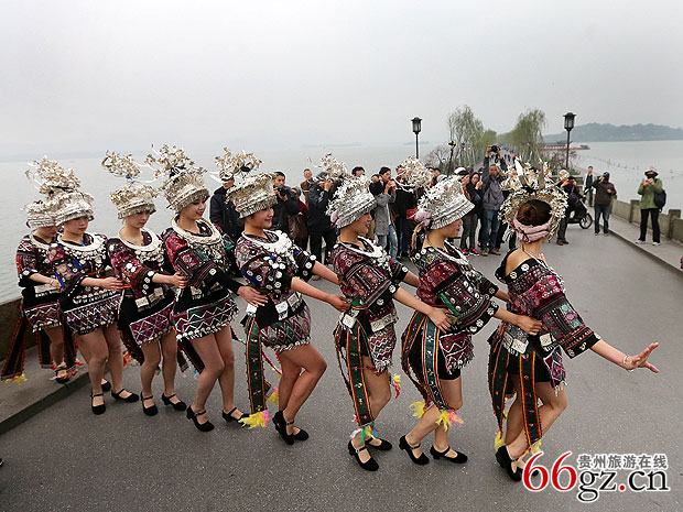 贵州旅游在线讯 3月21日,原本平静的杭州西湖断桥边突然刮起了一阵“快闪”旋风, 20名姑娘小伙身着鲜艳少数民族盛装,载歌载舞。几位巧笑嫣然的苗族姑娘高唱着敬酒歌,端着牛角酒杯向路过的游人们敬酒;苗族小伙们吹起轻盈而高亢的芦笙,姑娘们按芦笙曲调节奏变换出优美姿势,头上的锦鸡银饰跃跃欲飞,银角冠一点一摇,腿边花带一飘一闪,裙脚边的“羽毛”银浪翻飞。热情歌舞映衬灵秀西湖,强烈的声色反差吸引了大批游客驻足观看。