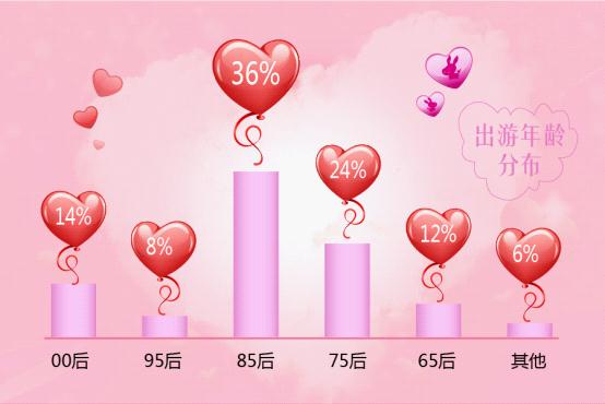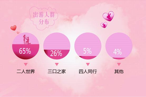 在驴妈妈预订七夕之旅的用户中,预订双人线路产品的比重最大,占比65%,且从年龄分布占比来看,出游者大多为年轻的情侣及夫妻,共度浪漫的“二人世界”;其次是暑期出游的主要群体——“三口之家”,占比26%。