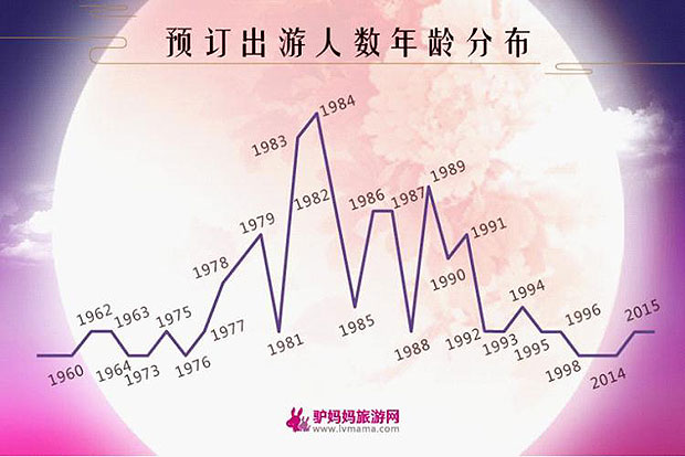 驴妈妈统计数据显示,截至目前为止,今年中秋小长假预订出游总人数同比于去年呈显著增长趋势,涨幅超过3倍;同时,由于假期较短,预备外出的游客或将尽早安排出游行程,因此,中秋期间,预订第一天出游的游客人数明显高于后两天;而在预订人群分布方面,三十岁左右的80后人群占据了较大比例,随着他们逐渐进入而立之年,家庭的主导地位开始显现,假期去哪儿,由他们说了算。