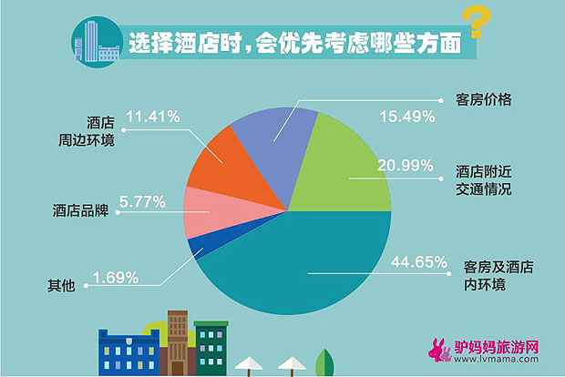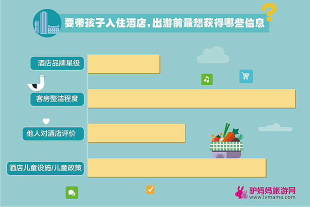 对于家庭集体出游的消费者来说,半数以上的家庭最关心的是客房的干净程度及酒店的儿童设施。以驴妈妈旅游网在售的上海迪士尼乐园酒店为例,除了酒店的干净有序令人难忘之外,在这片占地7公顷的空间中,大小游客还能与米奇、美人鱼、灰姑娘和狮子王辛巴等经典角色“不期而遇”,小朋友还有专属的室内儿童游乐园以及川顿王主题游泳池可以玩耍,客房内电视机下面的儿童床更是设计得充满巧思,因而深受亲子家庭的喜爱。