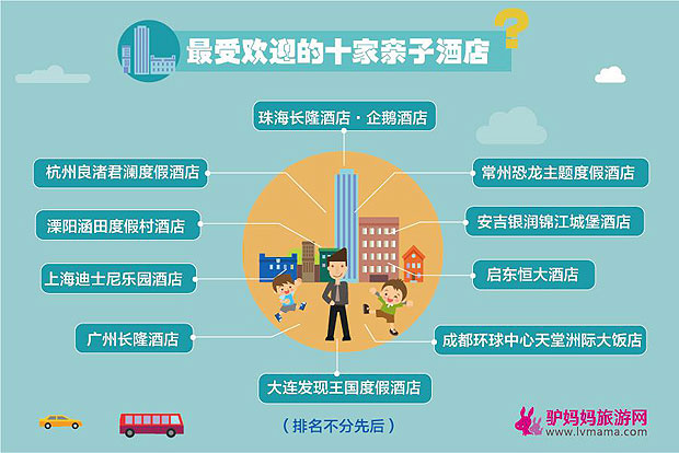《报告》显示,中国最受欢迎的十家亲子酒店分别是:杭州良渚君澜度假酒店、溧阳涵田度假村酒店、上海迪士尼乐园酒店、广州长隆酒店、珠海长隆酒店·企鹅酒店、常州恐龙主题度假酒店、安吉银润锦江城堡酒店、启东恒大酒店、大连发现王国度假酒店和成都环球中心天堂洲际大饭店(排名不分先后)。