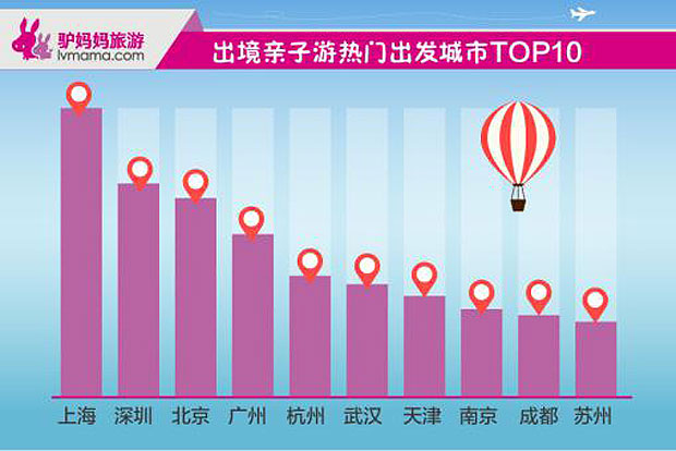 《报告》显示,上海、深圳、北京、广州、杭州、武汉、天津、南京、成都、苏州成为出境亲子游十大热门出发城市。其中,上海、深圳、北京、广州、杭州五地出游人次占全国总人次的51.49%,国内一线城市父母是出境亲子游的主力客群。