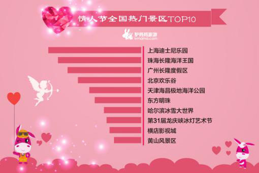 此外,现在年轻人也越来越会玩,情人节不再只是看电影、吃饭的老俗套,请假去景区约会已成情人节时尚。《报告》显示,2月14日当天,国内景区游玩人次较平时上涨1.5倍,上海迪士尼乐园、珠海长隆海洋王国、广州长隆度假区、北京欢乐谷、天津海昌极地海洋公园、东方明珠、哈尔滨冰雪大世界、第31届龙庆峡冰灯艺术节、横店影视城、黄山风景区成为国内十大热门景区。