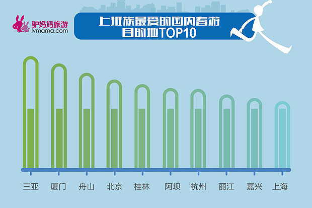驴妈妈数据显示,在春季最受上班族喜爱的国内长线游目的地TOP10分别是:三亚、厦门、舟山、北京、桂林、阿坝、杭州、丽江、嘉兴、上海。