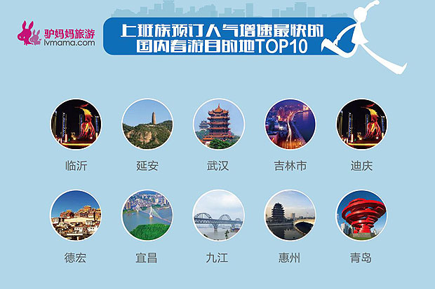 同时,驴妈妈大数据还显示,今年春季增速最快的十大国内长线游目的地分别是:临沂、延安、武汉、吉林市、迪庆、德宏、宜昌、九江、惠州、青岛。五一小长假期间,驴妈妈国内游推出了“跟团游每满2500减100”、“机酒自由行每满1500减100”的优惠,来“犒赏”广大上班族。