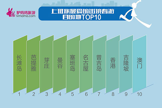驴妈妈数据显示,在春季最受上班族喜爱的出境游目的地TOP10分别是:长滩岛、芭提雅、芽庄、曼谷、塞班岛、名古屋、普吉岛、香港、吉隆坡、澳门。同比去年同期增速最快的十大出境游目的地则分别是:日本的宫古岛、法国的背风群岛、新西兰基督城、英国伦敦、加拿大多伦多、菲律宾长滩岛、泰国斯米兰群岛、澳大利亚悉尼、美国布法罗、美国拉斯维加斯。