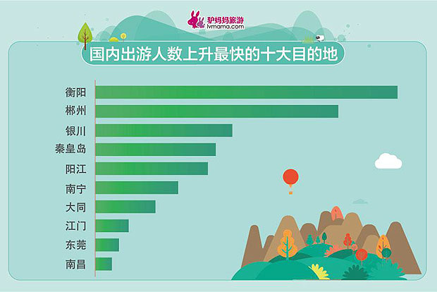 “说走就走”的游客大有人在,旅游选择的灵活性、随意性、碎片化趋势越发明显。从下单时间来看,出游前一周开始陆续迎来下单高峰,尤其是出游前2天,周边游订单量剧增,75%的游客从移动端下单,景区门口随订随玩的扫码购门票也成为不少游客的新选择。以旅游遛娃为主要休闲方式的亲子家庭成为五一假期的出游主力军,亲子自驾、亲子乐园、亲子酒店、亲子露营等亲子类主题的旅游产品受热捧。值得一提的是,今年五一小长假,三四线城市居民出游热情高涨。驴妈妈大数据显示,衡阳、郴州、银川、秦皇岛、阳江、南宁、大同、江门、东莞和南昌等十座城市快速崛起,名列五一国内十大出游人次上涨最快的目的地城市。