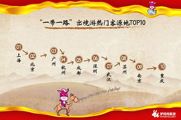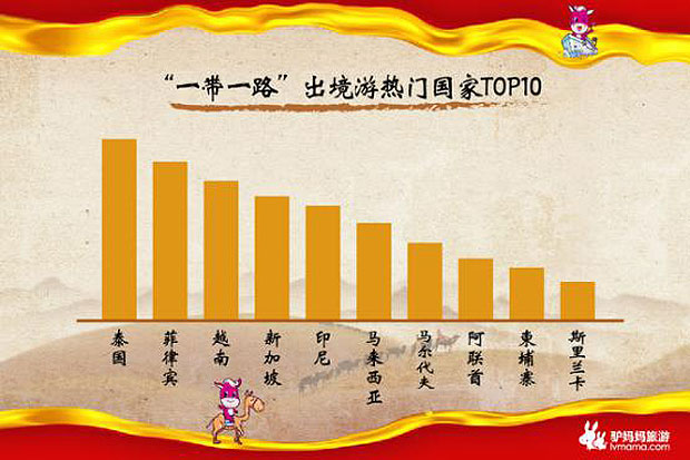 驴妈妈数据显示,在“一带一路”65个国家中,2016年中国游客前往人次最多的国家依次为泰国、菲律宾、越南、新加坡、印尼、马来西亚、马尔代夫、阿联酋、柬埔寨、斯里兰卡;中国游客同比增速较快的旅游国家依次为俄罗斯、文莱、波兰、捷克、匈牙利、尼泊尔、埃及、塞尔维亚、土耳其、斯洛伐克,中东欧国家占据该榜单半壁江山。