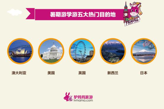 今年暑期游学游,哪些目的地最火呢?驴妈妈旅游网数据显示,截至目前,驴妈妈平台预订游学游的人次是去年同期的2.8倍,澳大利亚、美国、英国、新西兰、日本成为最受欢迎的五大游学目的地。在“中澳旅游年”的举办、直飞航班的增加等利好刺激下,今年暑期中国赴澳大利亚游学人次大大提升,较去年同期上涨3倍,成为今年最火的游学游目的地。此外,新西兰五年往返签证的实施,也带动了国人赴新旅游的热情,今年暑期赴新游学人次较去年同期上涨2.2倍,同比大增。